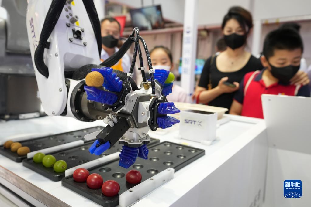 參觀(guān)者在2022世界機器人博覽會(huì )觀(guān)看軟體機器人果蔬分選平臺演示(8月19日攝)。