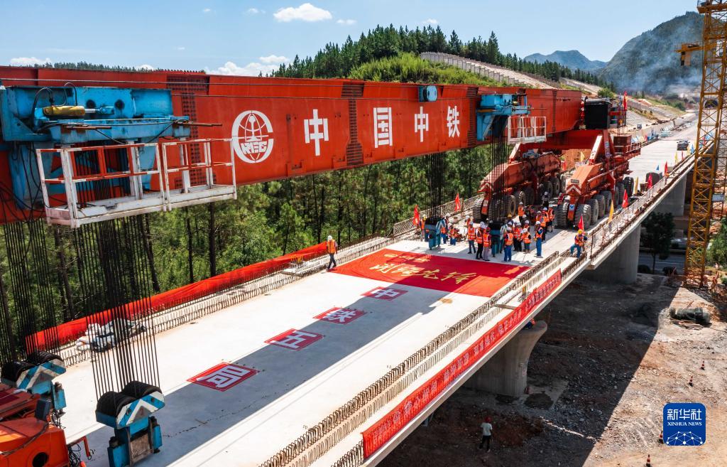 這是宣績(jì)鐵路站前二標首孔箱梁架設現場(chǎng)(8月21日攝,無(wú)人機照片)。