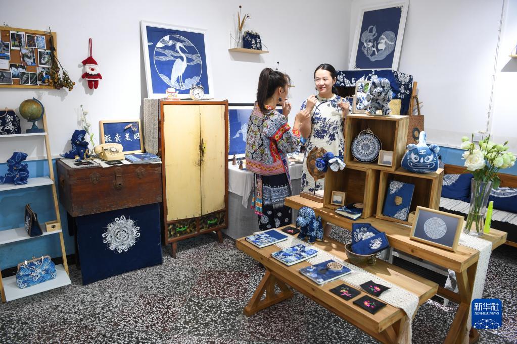 張娟娟(左)在蠟染體驗工作室里給顧客介紹自己設計的蠟染文創(chuàng )產(chǎn)品(8月18日攝)。