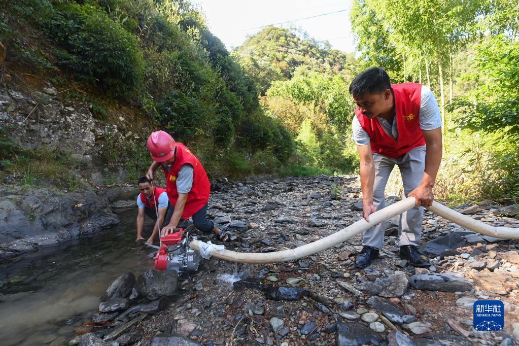 8月22日,在浙江省淳安縣屏門(mén)鄉將坑村,黨員志愿者在山間小溪里安裝抽水機和水管。