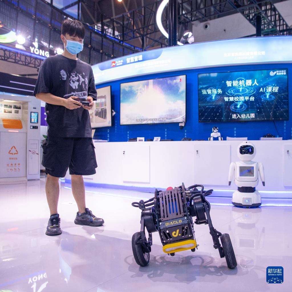 8月22日,在2022智博會(huì )重慶九龍坡區展廳,工作人員在操作雙足機器人。