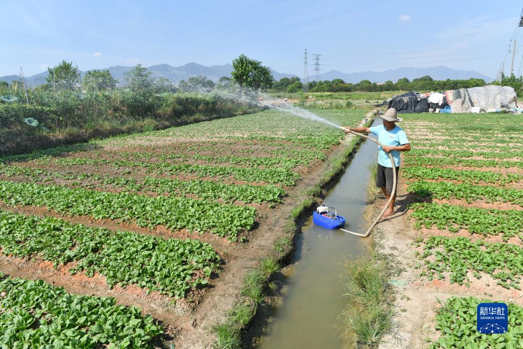 8月22日,在浙江省東陽(yáng)市城東街道塘西村的農田里,蔬菜種植戶(hù)利用抽水機給蔬菜澆水。
