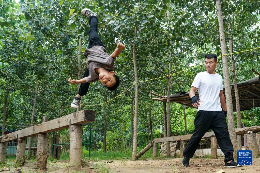 劉龍(右)指導兒子劉亦行進(jìn)行障礙訓練(8月16日攝)。