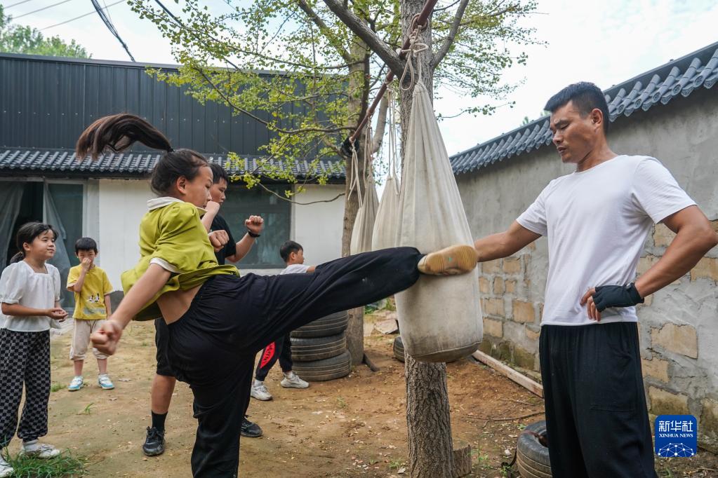劉龍(右一)指導女兒劉亦點(diǎn)練武(8月16日攝)。