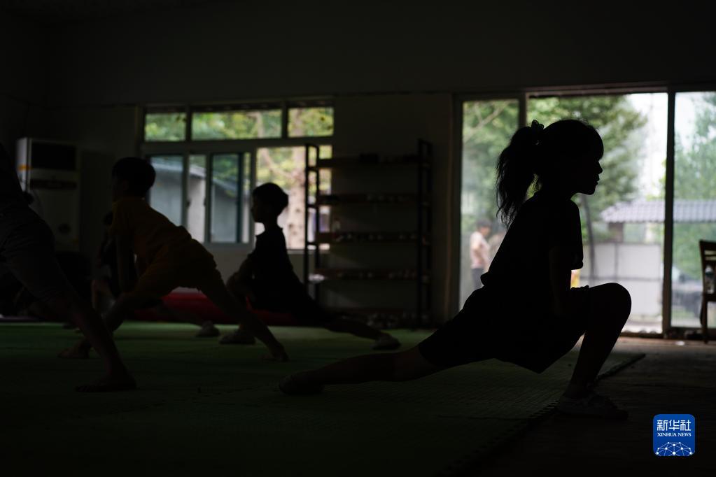 孩子們在練武前熱身(8月16日攝)。