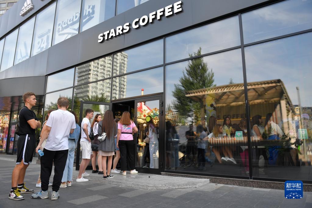 8月22日,人們在俄羅斯莫斯科排隊等待進(jìn)入一家“星咖啡”門(mén)店。