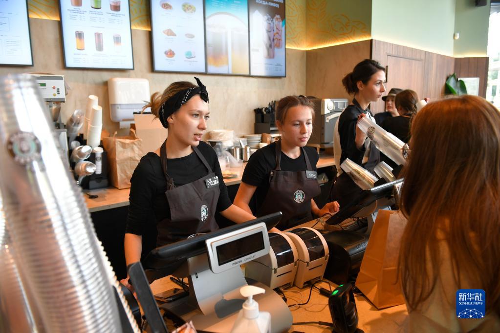 8月22日,工作人員在俄羅斯莫斯科的一家“星咖啡”門(mén)店為顧客點(diǎn)餐。