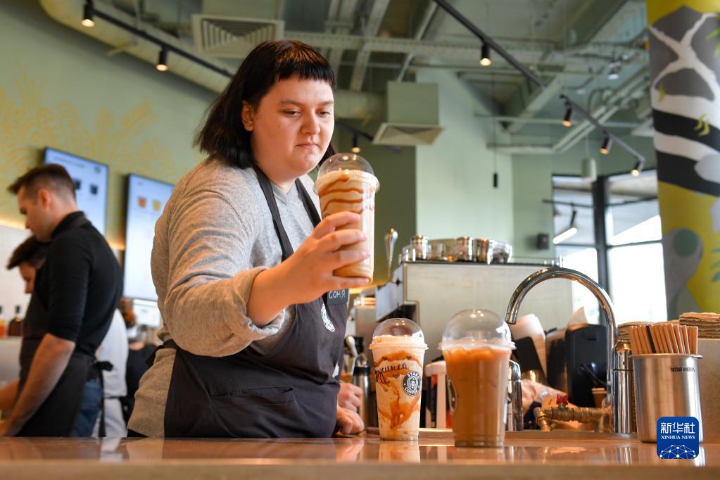 8月22日,工作人員在俄羅斯莫斯科一家“星咖啡”門(mén)店為顧客準備飲品。