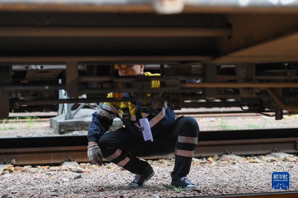 8月22日,在烏海西站編組場(chǎng),調車(chē)員在檢查車(chē)底設備。