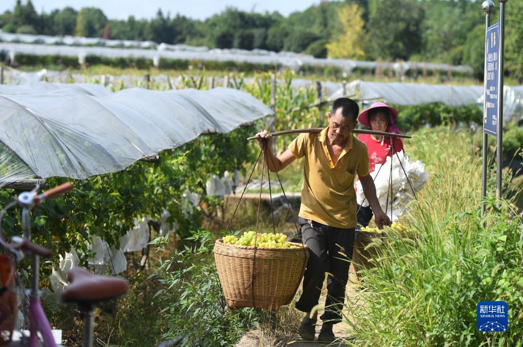 8月23日,在廣西全州縣才灣鎮毛竹山村,當地村民將收摘的葡萄挑出葡萄園。
