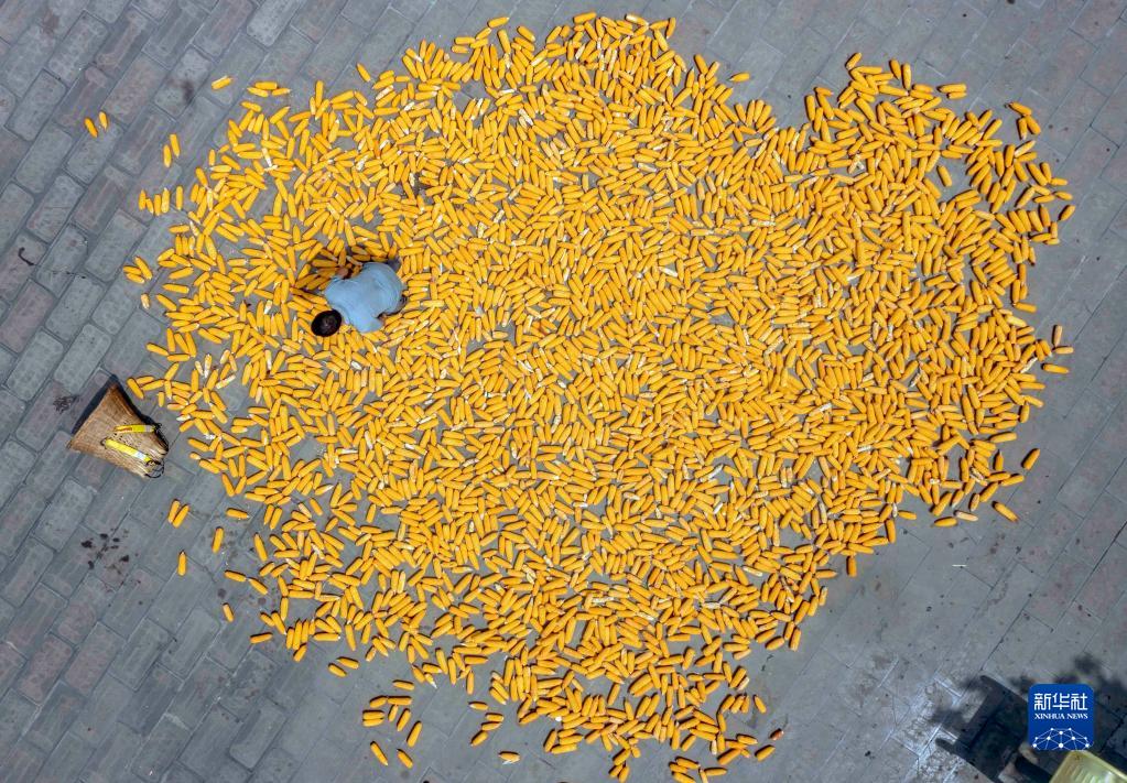 8月23日,村民在貴州省黔西市谷里鎮谷興社區晾曬玉米(無(wú)人機照片)。