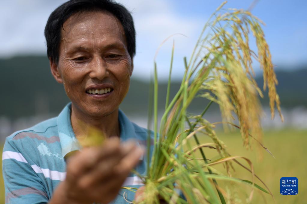 8月23日,村民在貴州省綏陽(yáng)縣旺草鎮萬(wàn)畝大壩水稻收割現場(chǎng)查看稻谷的飽滿(mǎn)度。