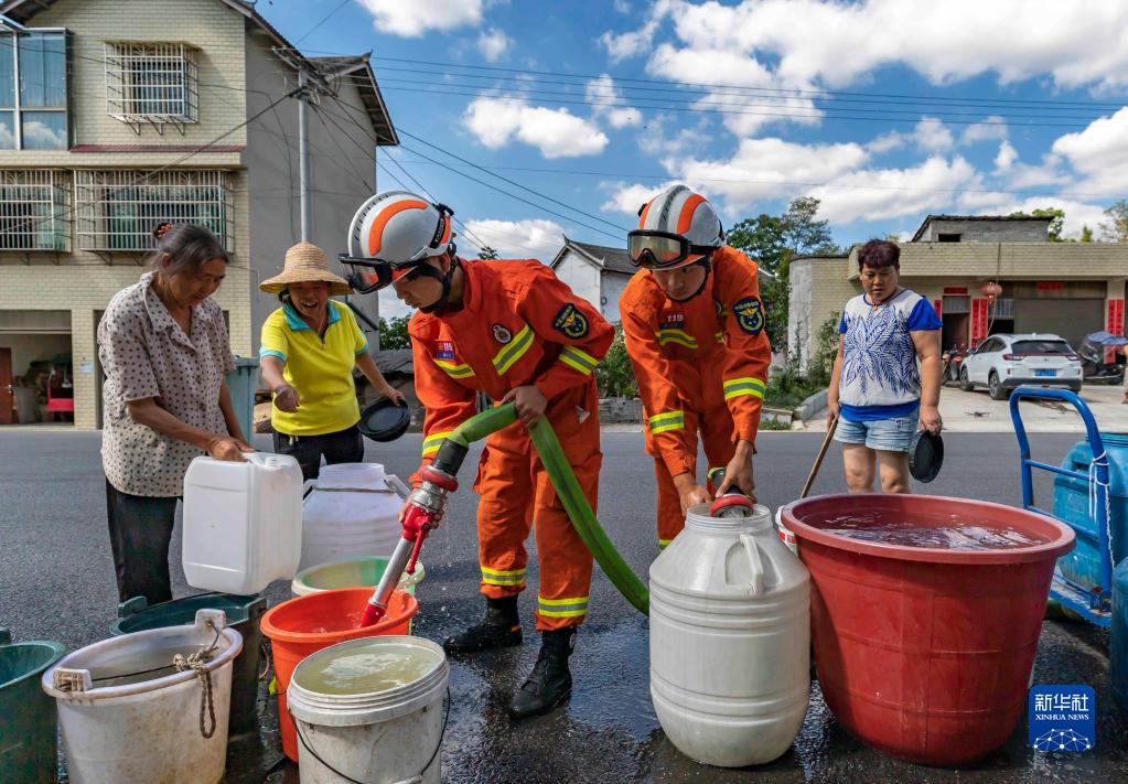 8月22日,消防救援隊員在貴州省黔西市文峰街道興黔社區為群眾送水。