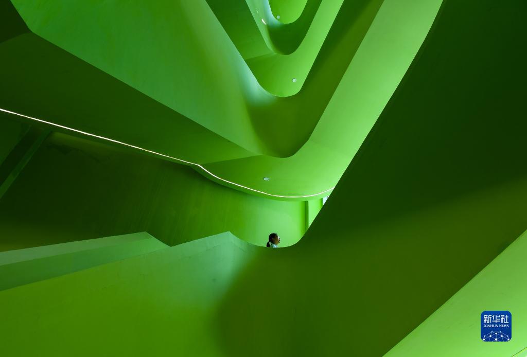 8月23日,一名物業(yè)人員行走在廣州南沙民心港人子弟學(xué)校教學(xué)樓旋轉樓梯上。