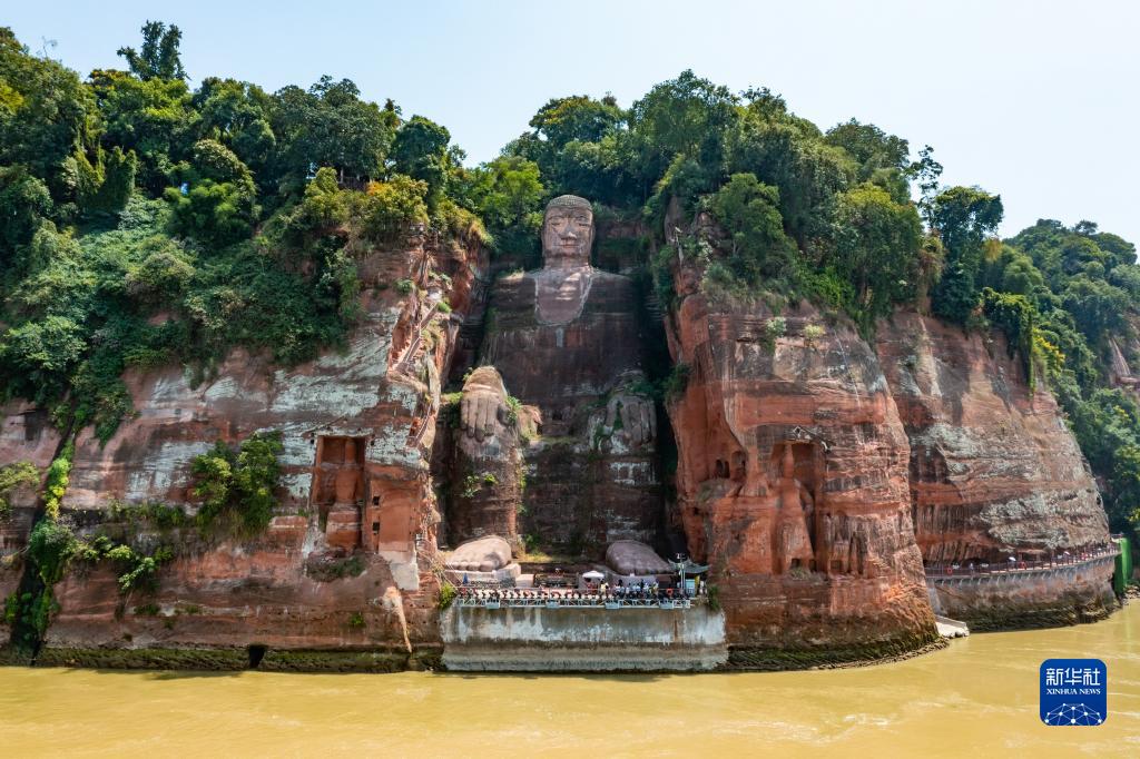 這是8月23日拍攝的露出底座的樂(lè )山大佛(無(wú)人機照片)。
