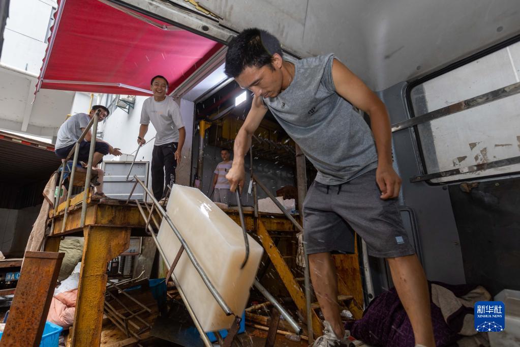 8月16日,上海玉湖制冰有限公司制冰師們接力運送冰塊。新華社記者 王翔 攝
