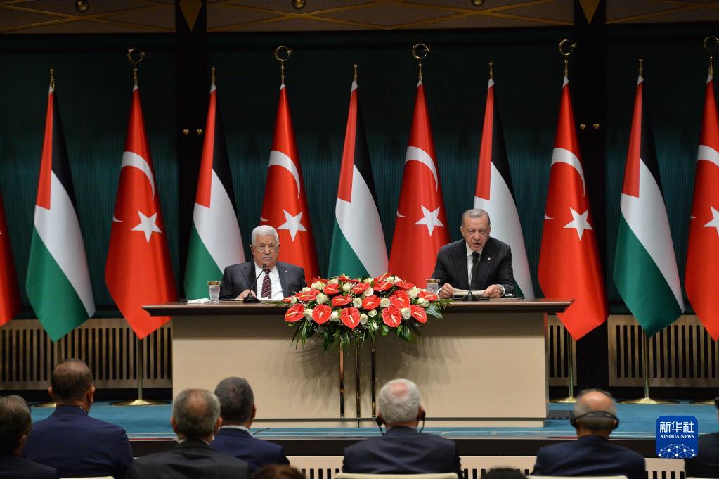 8月23日,土耳其總統埃爾多安(右)在首都安卡拉與到訪(fǎng)的巴勒斯坦總統阿巴斯舉行聯(lián)合記者會(huì )。