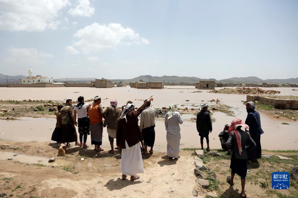 8月23日,在也門(mén)扎馬爾省馬巴爾地區,人們查看被洪水淹沒(méi)的土地。