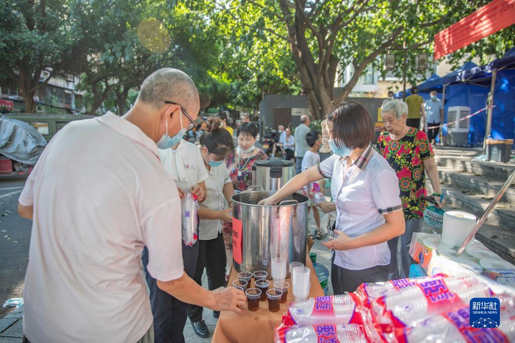 8月24日,在重慶市兩江新區龍壽路社區采樣點(diǎn)附近,工作人員為前來(lái)檢測的居民準備酸梅湯解暑。