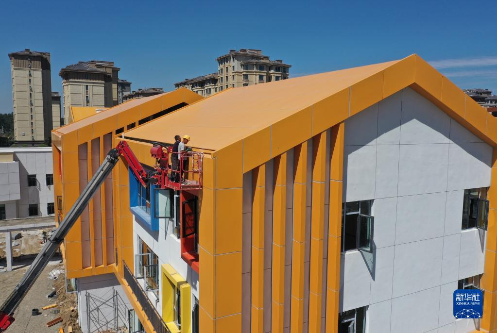 8月25日攝,工人在雄安新區容西片區一學(xué)校項目進(jìn)行施工(無(wú)人機照片)。