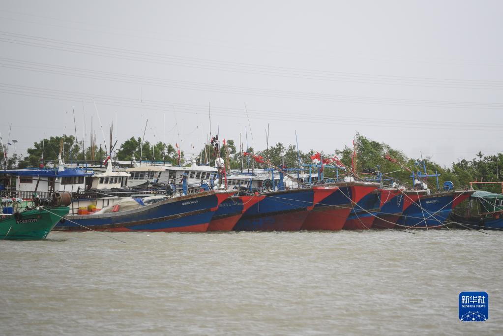 8月25日,廣東陽(yáng)江市對岸漁港停泊著(zhù)回港避風(fēng)的漁船。