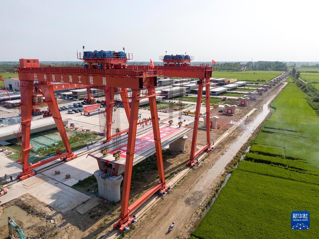 8月25日拍攝的滬渝蓉高鐵天門(mén)段首榀箱梁架設現場(chǎng)(無(wú)人機照片)。