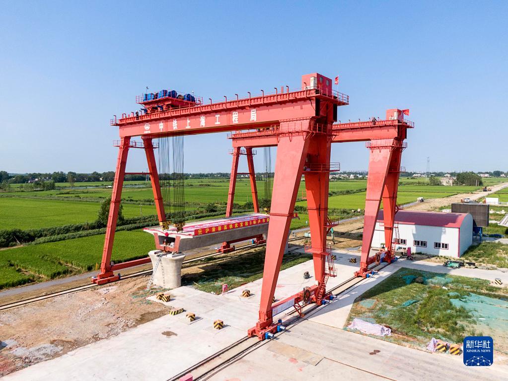 8月25日拍攝的滬渝蓉高鐵天門(mén)段首榀箱梁架設現場(chǎng)(無(wú)人機照片)。
