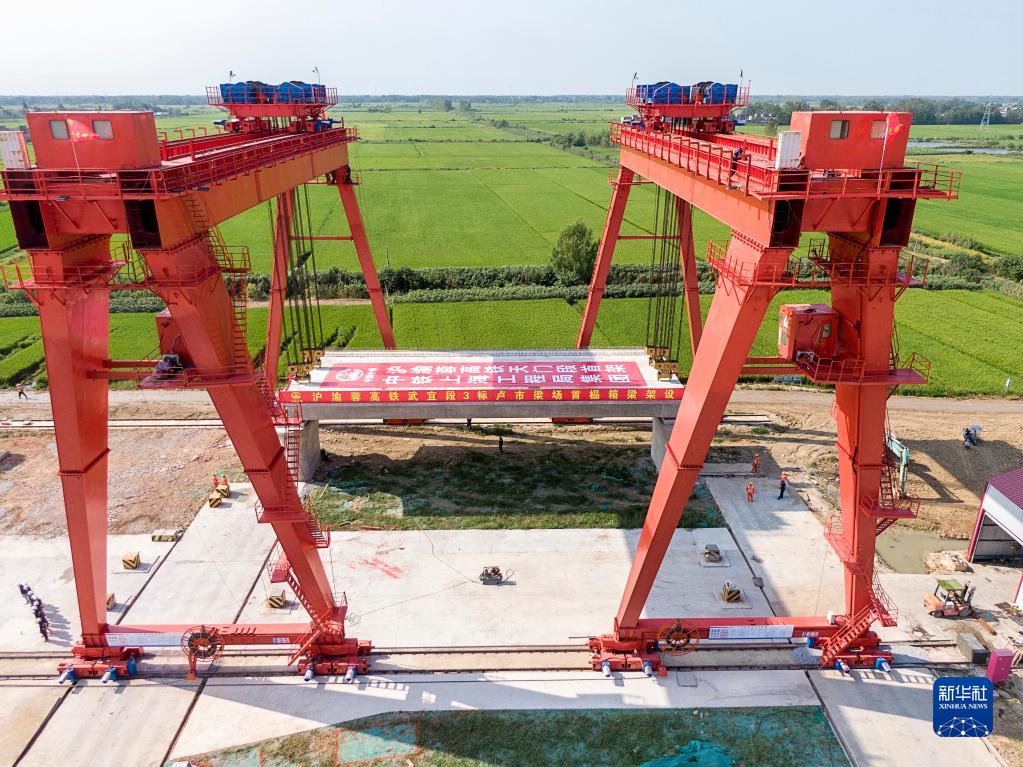 8月25日拍攝的滬渝蓉高鐵天門(mén)段首榀箱梁架設現場(chǎng)(無(wú)人機照片)。