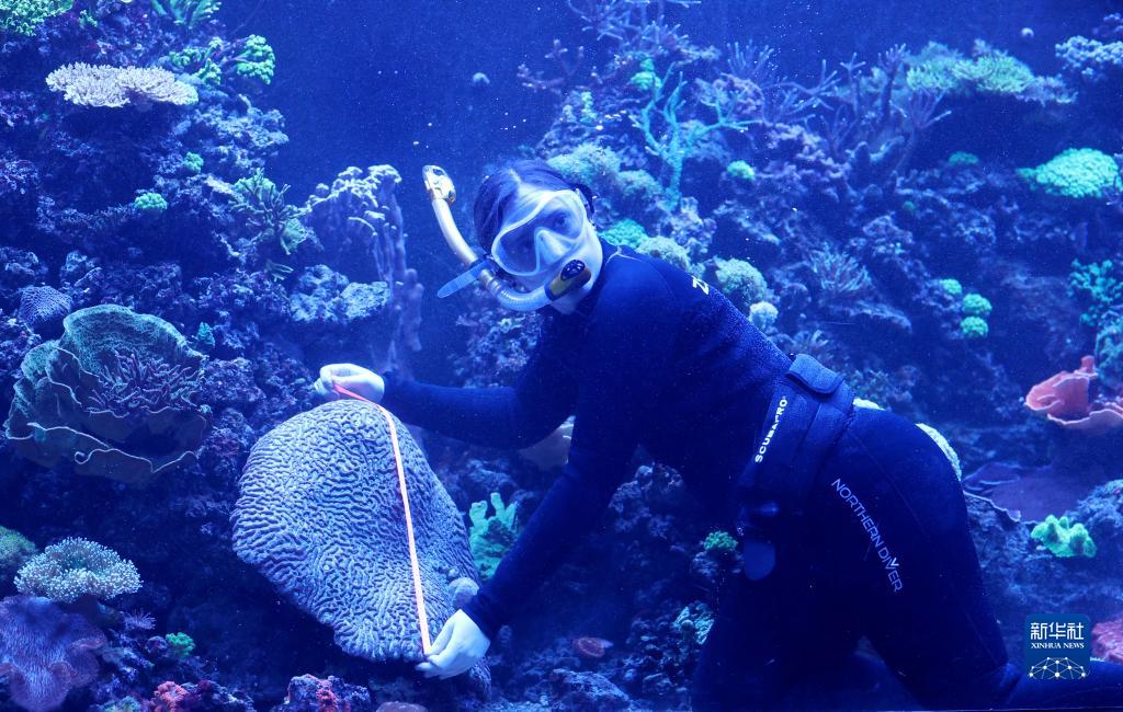 8月25日,在英國倫敦動(dòng)物園,工作人員測量珊瑚長(cháng)度。