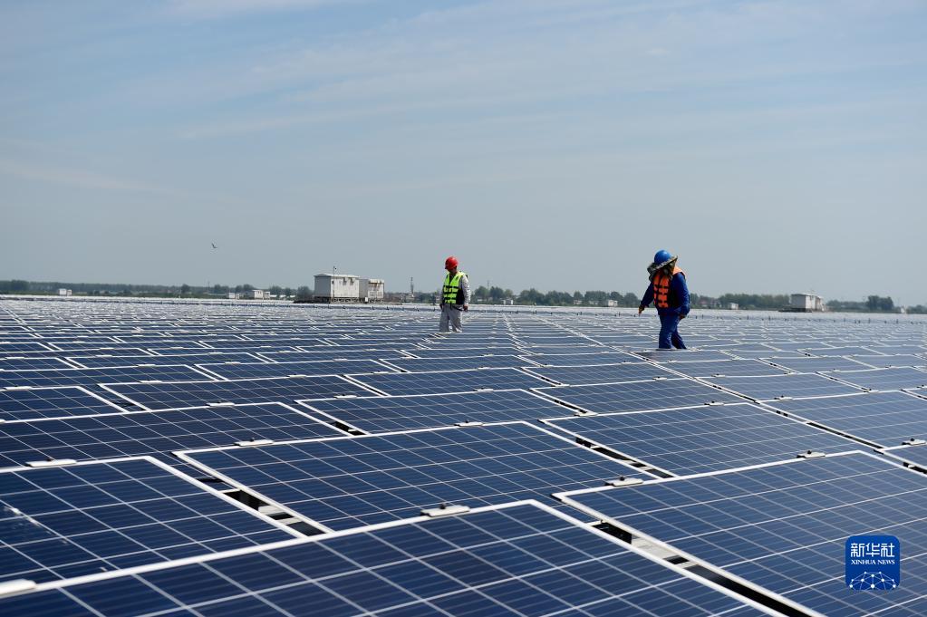 8月25日,運維人員在潁上縣毛圩水上光伏電站進(jìn)行巡檢。