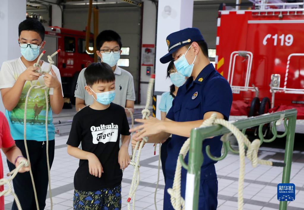 8月26日,消防員向學(xué)生們講解繩結的綁扎技巧。