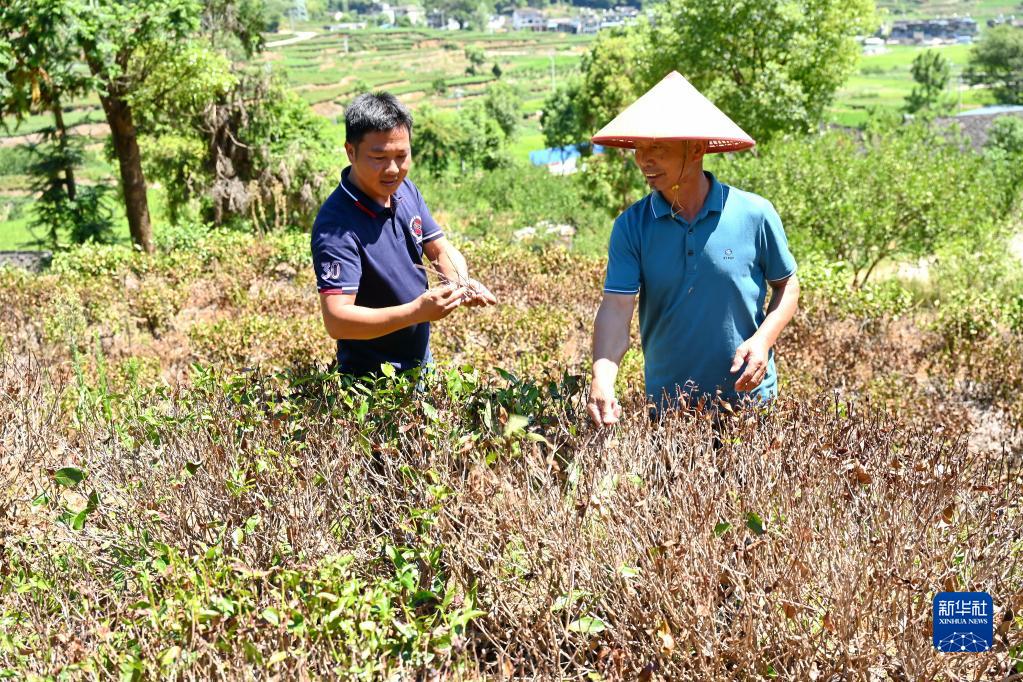 8月25日,寧德市霞浦縣牙城鎮棗嶺村黨支部書(shū)記雷大明(左)向茶農黃鴻錫了解茶葉高溫干旱受損情況。