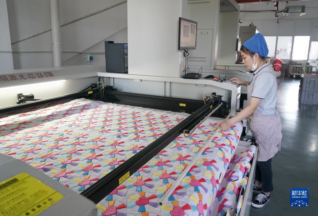 在安康市恒口示范區一家毛絨玩具生產(chǎn)企業(yè)車(chē)間內,工人操作機器生產(chǎn)毛絨玩具面料(2021年7月7日攝)。