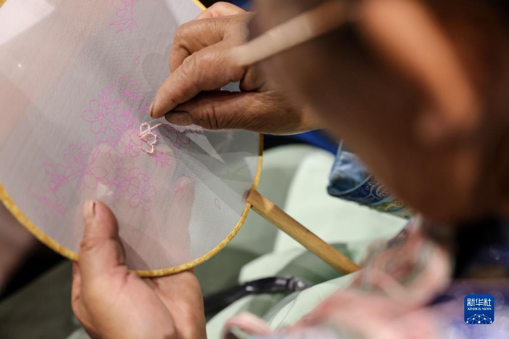 8月26日,貴陽(yáng)市花溪區青巖鎮山王廟村的婦女在刺繡扇面。