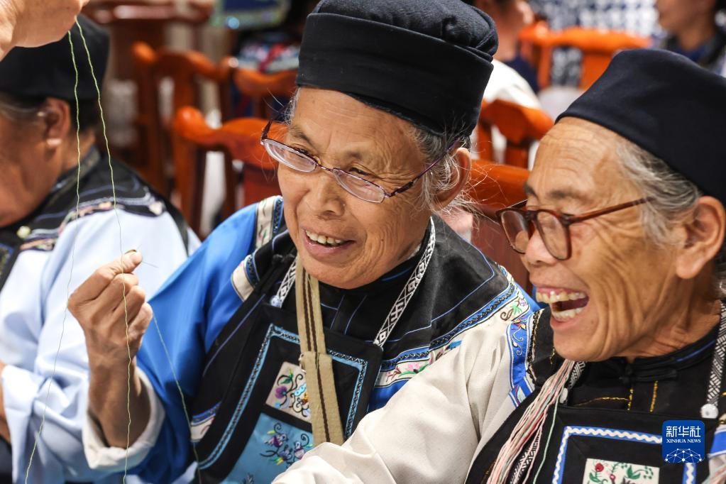 8月26日,貴陽(yáng)市花溪區青巖鎮山王廟村的婦女在接受刺繡指導中互相交流。