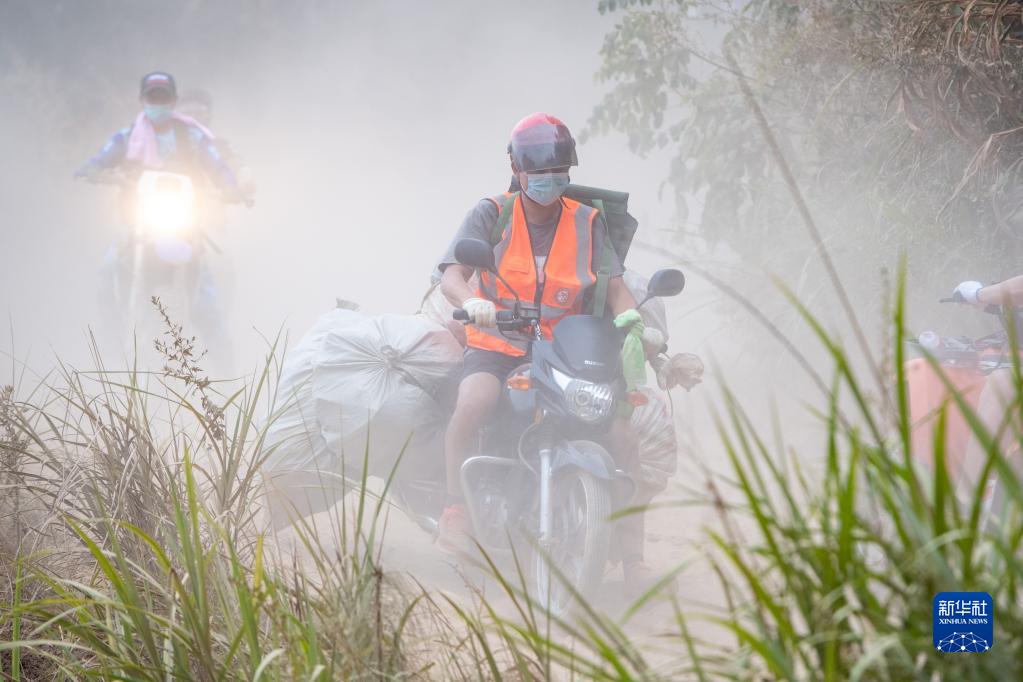 8月26日,在重慶北碚區歇馬街道,“摩托大軍”志愿者運送物資上山。