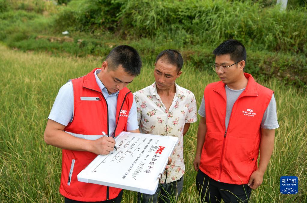 8月26日,在銅仁市沿河縣譙家鎮桂鮮村,保險公司工作人員在查勘農民的水稻因旱受損情況。