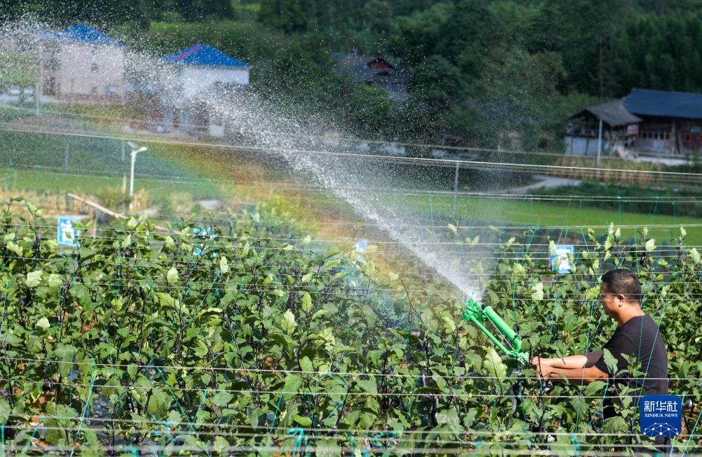 8月25日,在遵義市務(wù)川縣分水鎮中壩村,村干部在調節自動(dòng)噴灌系統給蔬菜基地的茄子樹(shù)澆水。