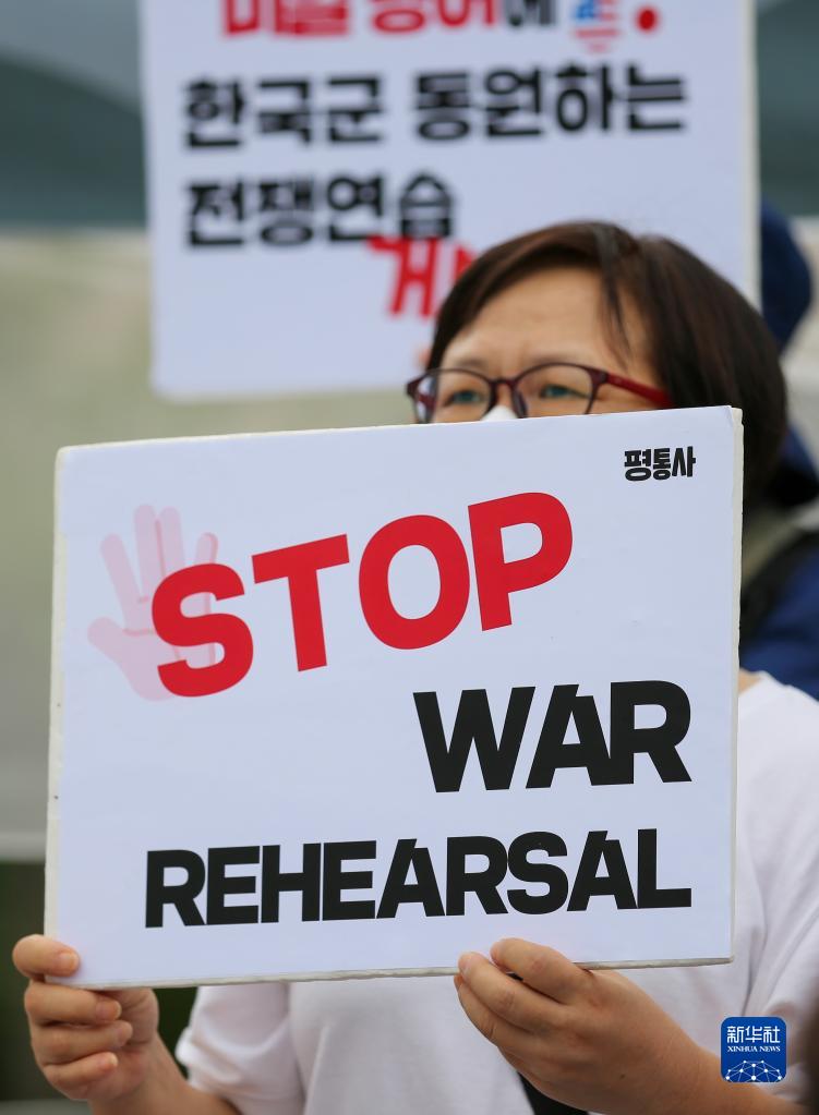 8月22日,集會(huì )者手持標語(yǔ)牌在韓國首爾參加集會(huì )反對韓美軍演。韓美兩國軍隊22日正式啟動(dòng)下半年“乙支自由之盾”聯(lián)合軍演。韓國多個(gè)民間團體當天在首爾舉行抗議集會(huì )。新華社記者 王益亮 攝