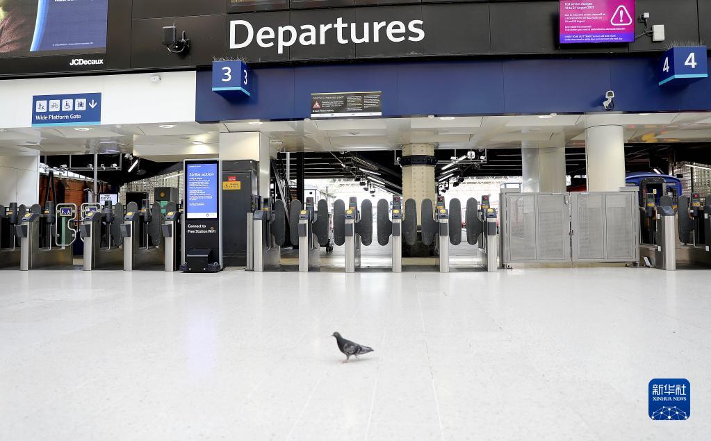 8月20日,一只鴿子走在英國倫敦滑鐵盧火車(chē)站大廳內。在通貨膨脹的影響下,由于薪酬、養老金等問(wèn)題,英國鐵路員工在8月20日舉行罷工。新華社記者 李穎 攝