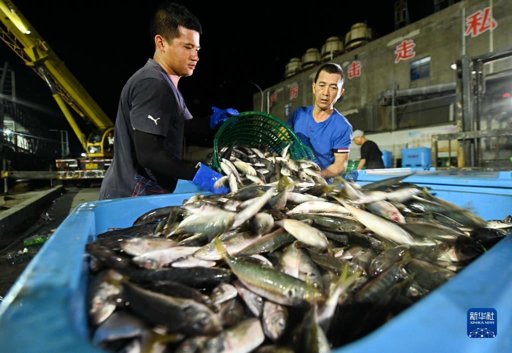 8月26日,工人在寧德市霞浦縣三沙中心漁港的碼頭上分裝漁獲。