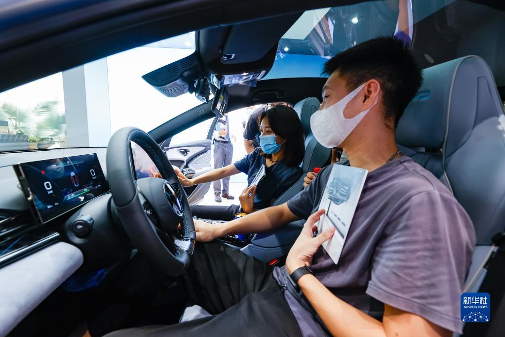 8月26日,在第二十五屆成都國際汽車(chē)展覽會(huì )的比亞迪汽車(chē)展臺,參觀(guān)者在體驗比亞迪海洋網(wǎng)純電動(dòng)汽車(chē)“海豹”。