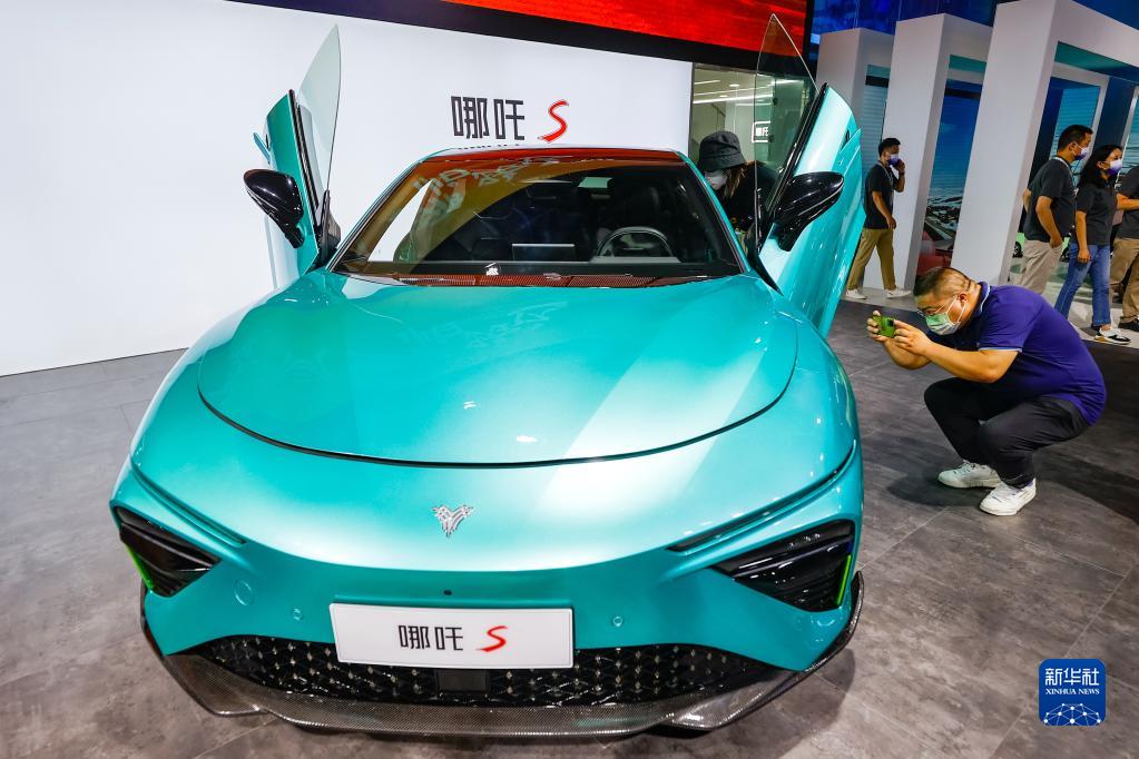 8月26日,在第二十五屆成都國際汽車(chē)展覽會(huì )的哪吒汽車(chē)展臺,參觀(guān)者在拍攝運動(dòng)型智享轎跑哪吒S。