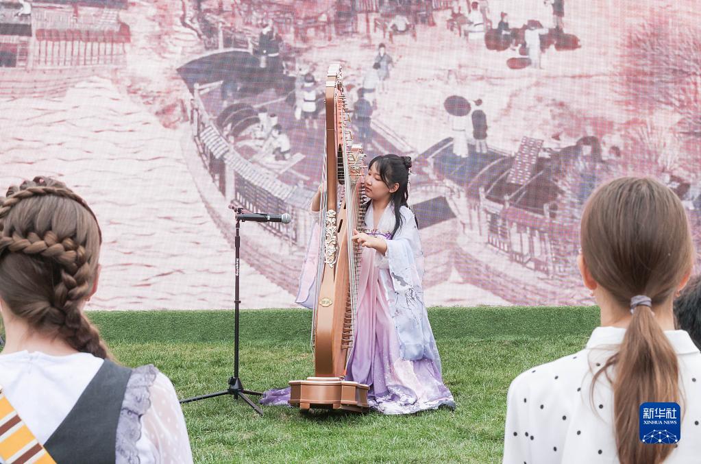 8月27日,小演員在招待會(huì )上表演箜篌獨奏《清明上河圖》。