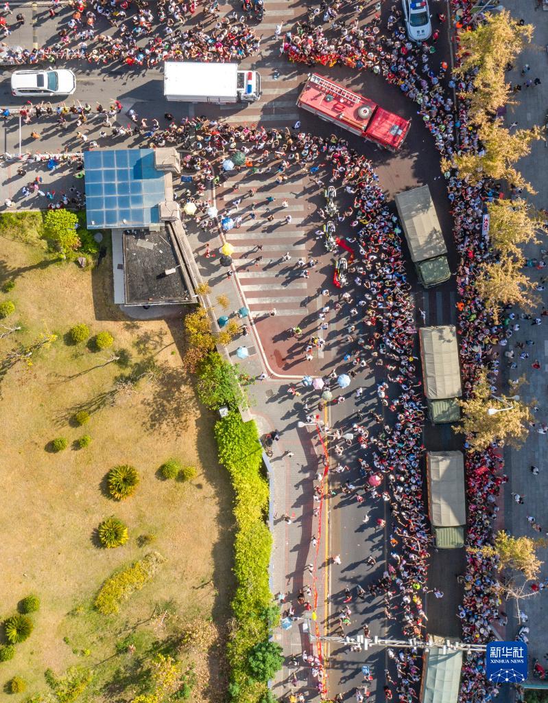 8月28日,在重慶市北碚區,群眾自發(fā)來(lái)到道路兩旁歡送森林消防隊員(無(wú)人機照片)。