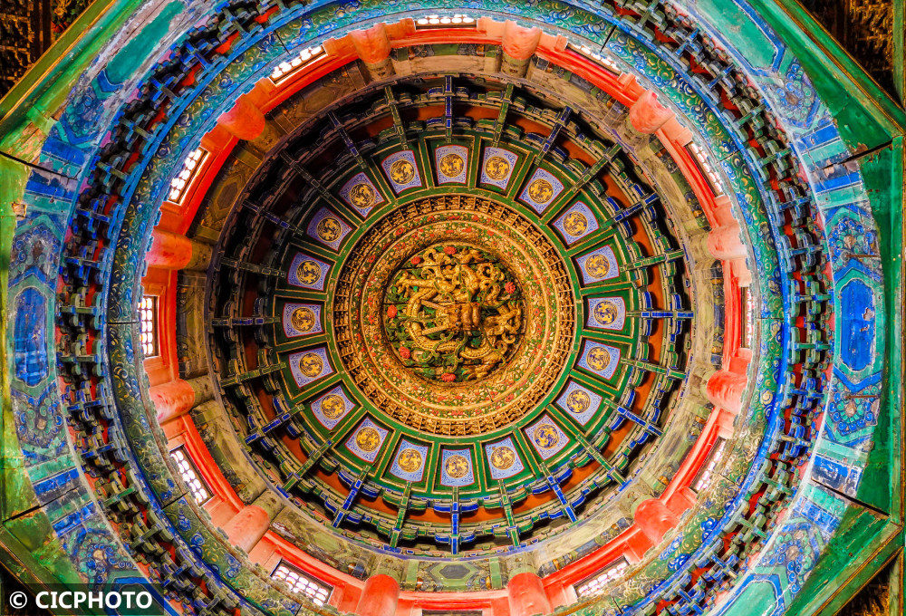 ↑2022年8月27日在北京故宮博物院御花園萬(wàn)春亭拍攝的蟠龍藻井。CICPHOTO/呂昊俊 攝