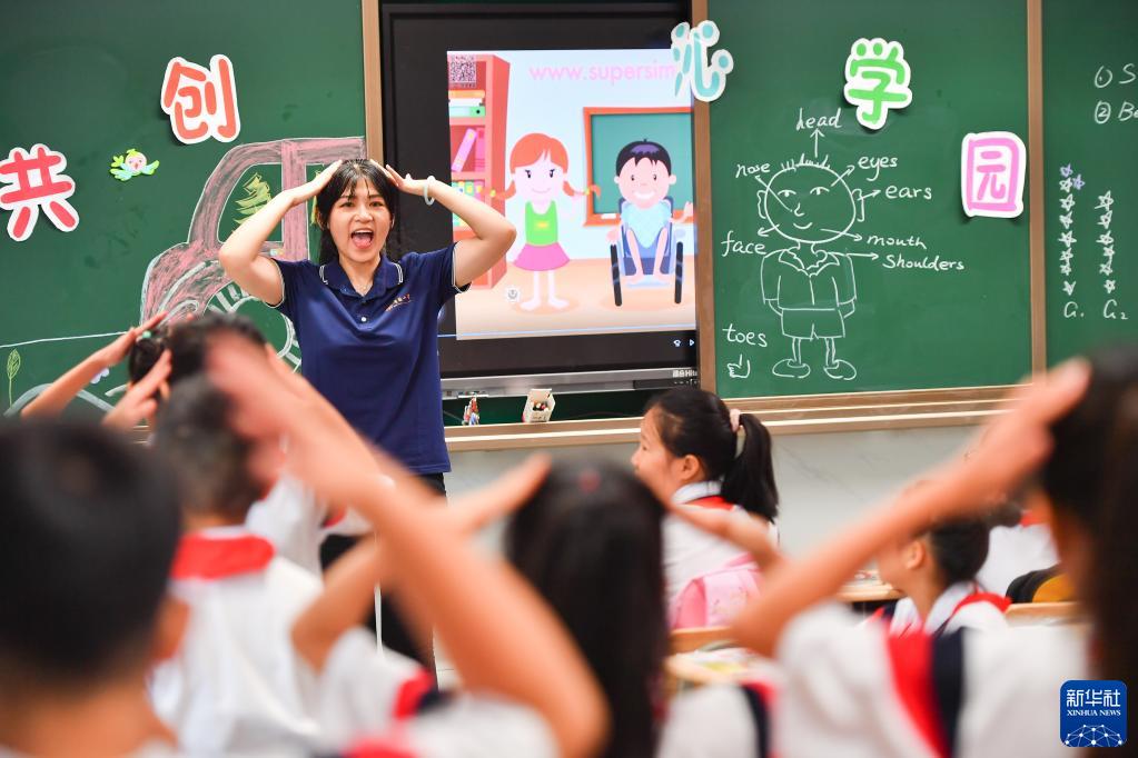 8月29日,在長(cháng)沙市天心區青園南湖小學(xué),老師在英語(yǔ)課上和學(xué)生互動(dòng)。