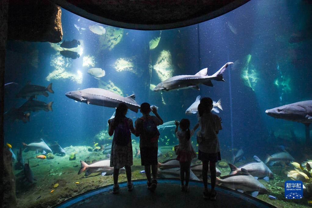 夜宿在珠海長(cháng)隆海洋王國鯨鯊館的體驗者夜游海洋王國(8月27日攝)。