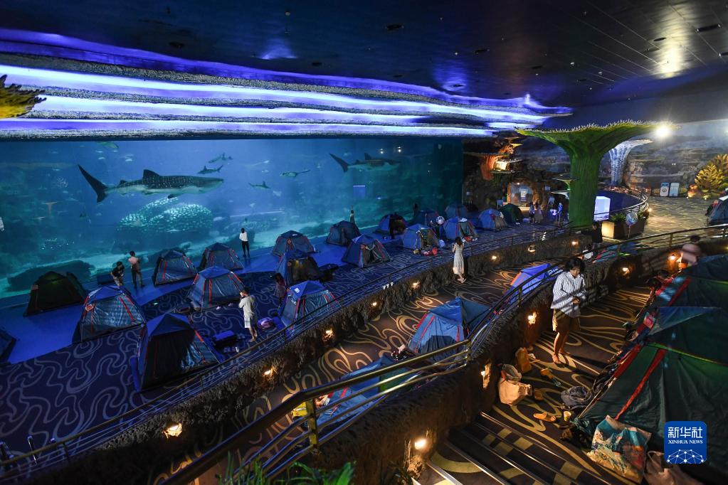 8月27日,體驗者在珠海長(cháng)隆海洋王國鯨鯊館搭帳篷夜宿,在鯨鯊保育專(zhuān)家的科普中增長(cháng)知識,近距離體驗與鯨鯊等海洋生物同眠的奇妙之夜,感受人與自然和諧相處,傳遞生態(tài)保護理念。