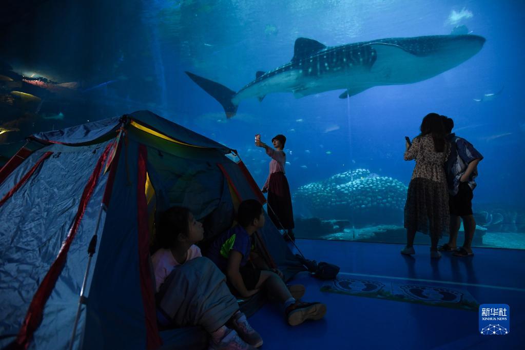 8月27日,體驗者在珠海長(cháng)隆海洋王國鯨鯊館搭帳篷夜宿,在鯨鯊保育專(zhuān)家的科普中增長(cháng)知識,近距離體驗與鯨鯊等海洋生物同眠的奇妙之夜,感受人與自然和諧相處,傳遞生態(tài)保護理念。